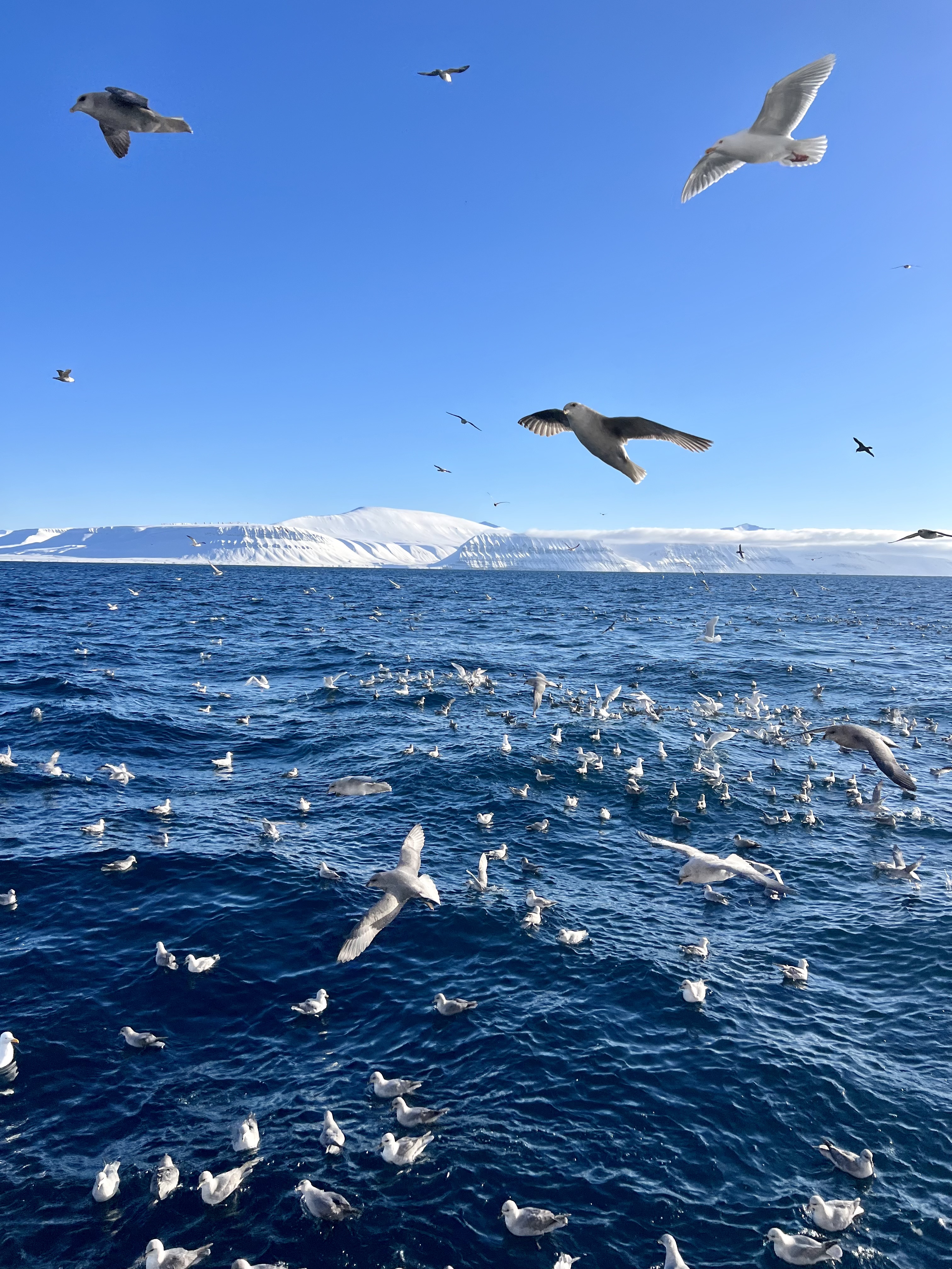 - Northern Fulmars + Glaucous Gulls chasing the Helmer Hanssen in Isfjorden